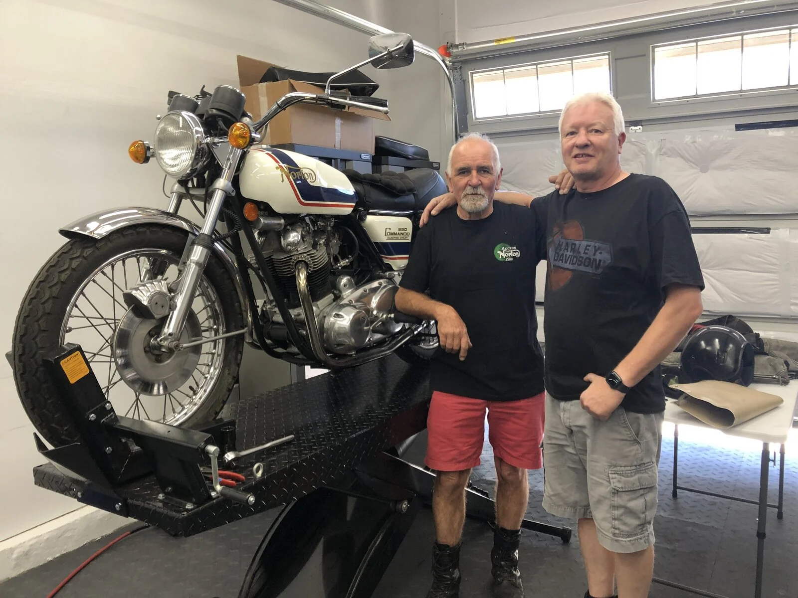 Its been very nice to meet Murray. He is the President on the NZ owners club. He flew from NZ to Chicago and purchases a nice MK3 on ebay. He drove 13 hrs return to Minneapolis to collect the bike. Gave it a once over in Dixon Illinois, changed the rear tire/ tyre, pannier (see photo) where Tim Smith really helped (Tim if you read this Murray says thanks) rode to Iowa and back to Chicago, where it broke down 20 miles out of Chicago due to a charging issue. Fitted a new battery to get to a friends place in Bollingbrook Illinois. Solid state rectifier had failed! Went to Morries Place (Thanks again Tim he said) Ribbonwood/ Illinois, just north of Chicago. Murray said they were friendly and helpful. Left Chicago and he rode to the American pickers shop in le Claire Iowa on the banks of the Mississippi river. Then he went to the American national motorcycle museum in Anamosa. He rode across Nebraska, where I met him. We met via phone calls and emails from NZ.