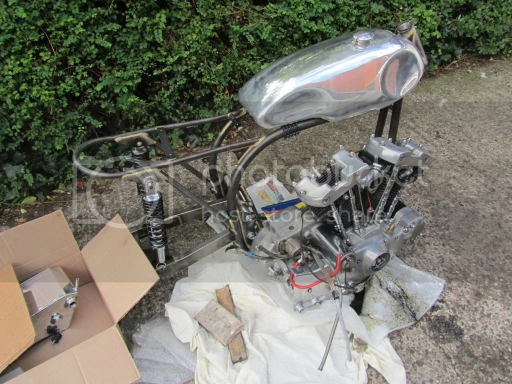 That motor actually looks good in there. But getting a decent gearset might be a problem. It is no longer a Harley, and probably will not be used like one. With 18 inch wheels and the centre of gravity a bit back, it should not be heavy handling. Interesting !The day the frame arrived, I put the engine in, took two of us, but it went in without too much swearing on my part.. oh and I'll be changing those gofd awful 'custom' pushrod covers too..