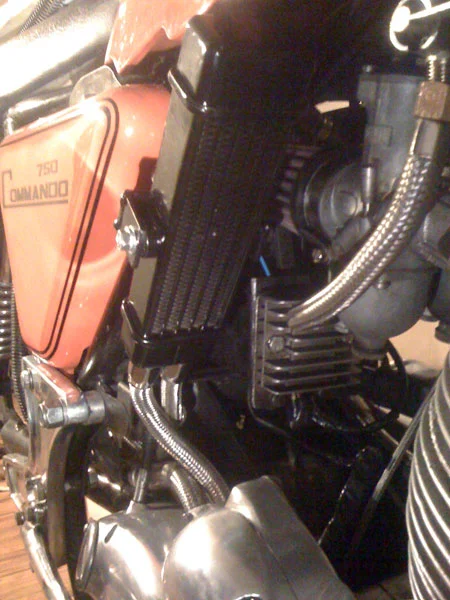 Picked up a Jagg oil cooler for a steal (broken link removed) and the p-clamps finally arrived this evening. The whole install took only 20 mins. I chose the location mostly for ease of access to the oil lines. Given that the bike now incorporates both an oil cooler, filter as well as the anti sump valve, I think I'll start running 20/50 in her rather than the straight 50 I've been using to date.