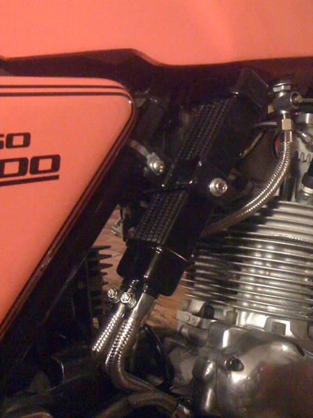 If you run the bike only in warm weather I'd think an always-on cooler would be all right--its location behind the engine will make the airflow somewhat warmer than if it were placed on the front downtubes like mine. In cooler weather or in prepping for an oil change you might consider enclosing the cooler in foam insulation or the like to boil off some of the water and other condensed contaminants in the oil.