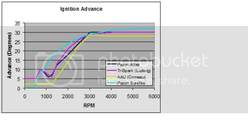 First, the advance curve. I've compared it here to the curves from the standard Pazon Surefire (I've been running this EI on my British bikes for the past few years), TriSpark (from Ludwig), and the AAU (from Dave Comeau).
