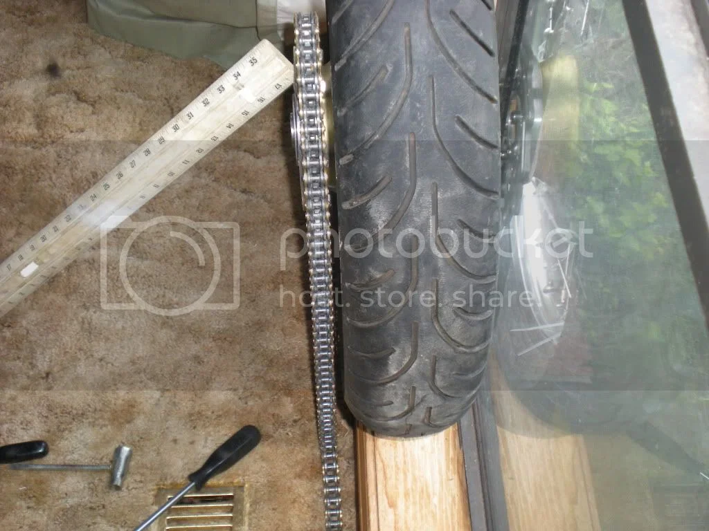 Here's half way truthful photo, as leaning a bit to photo, but I verified by leveling tire to let gravity pull chain in its run path to see clear space. Now if 530 Xring can just cutting its own clearance in the inner cover and gear box, everything working out as dreamed it should. Sprocket position was determined by hanging frame-cradle-gearbox and axle from rafters so gravity pulled chain in line with drive loads. I use level to verify hanging plum bob straight down.