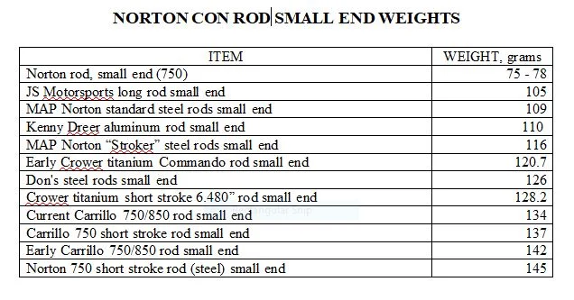 Over the years, I've compiled a fair amount of data on engine weights and balancing info for Norton twins, and I've extracted this table of small end weights from it. I haven't kept it up to date for a couple of years, but most of the data is probably still correct. There have been variations on some of the rod weights, and these are a combination of ones I've personally measured as well as data taken from manufacturers' specs. For example, I know Jim Schmidt has been working to reduce the weight of his rods as much as possible, and may have some now that are even lighter than the ones I measured some years ago.