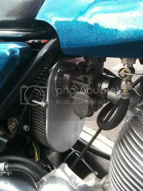What I am trying to accomplish, is to be able to use the stock aircleaner and backplate. I want to use the Norvil single carb filter plate. I may have to cut down the perferatod metal filter surround and find a thinner filter. I'd like to keep the stock airbox "appearance" and still have some reasonable filter area. The Mikuni Flatslide TM34 carb I want to use is thinner than a Mikuni Roundslide VM or Amal MKII, so "maybe" I can get things to fit, look and work to my expectations.