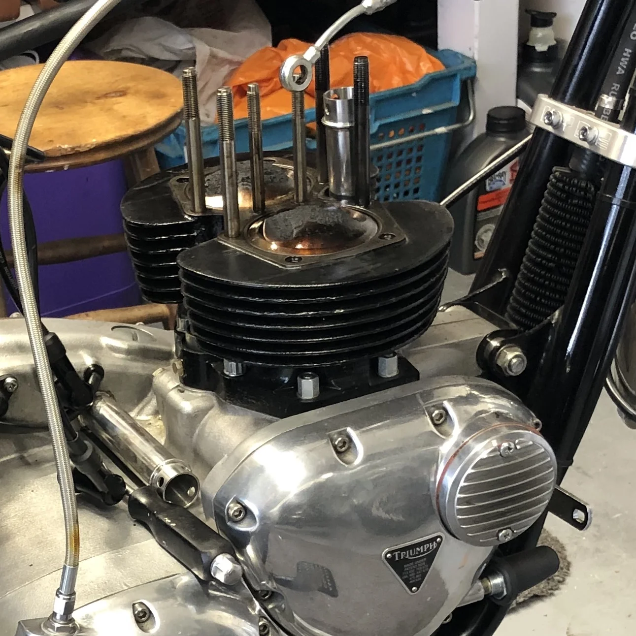 Using gasket goo recommended by Matchless some time ago, I dispensed with the base gasket, this and the copper head gasket tightened the squish to 0.34”-0.36” which I’m very happy with. The inlet valves were SO tight in the guides, meaning I had to drift them out! I suspected bent valves, but they weren’t. I struggle to see how this could have allowed proper valve control at high rpm, which I am blaming for the followers being marked, valve tips bruised and valves not seating correctly. I can only assume the engine builder thought ‘they’ll bed in’. I relieved the guides, fitted new followers and ground in the valves. The rocker shafts were clearly old, the rockers excellent, so I put new rocker shafts in too...