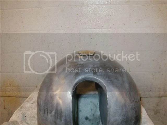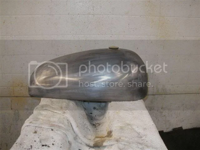 He started with a Hi-Rider tank that was pretty bashed up, "unbashed" it, cut out the stock filler neck and mounted a small, brass filler that I got from a chopper-place, lined it and she's home.