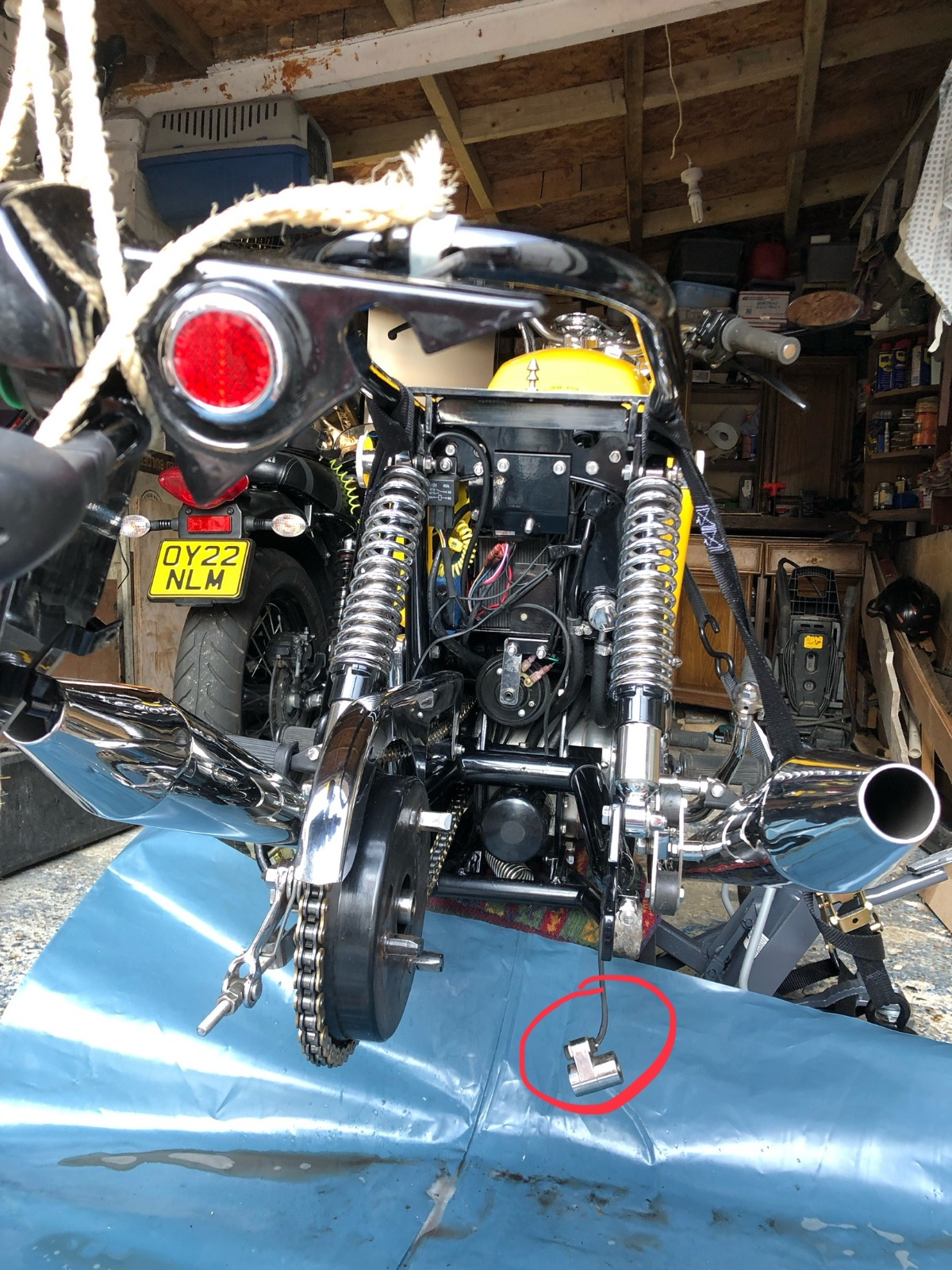 I ended up making a piece of 3mm aluminium plate to fit over three of the sensor "domes" then used a piece of 3/4" x 1 1/2" timber to lever between that plate and the rear of the swingarm. Will label those bits for next time.