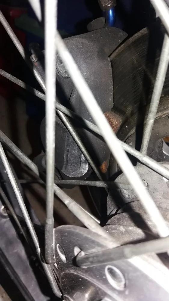 I was able to take 3mm off of my fork leg, used a 6mm spacer and only have a small clearance disc to fork leg, then took maybe 2mm off the caliper, but this is a different application.....