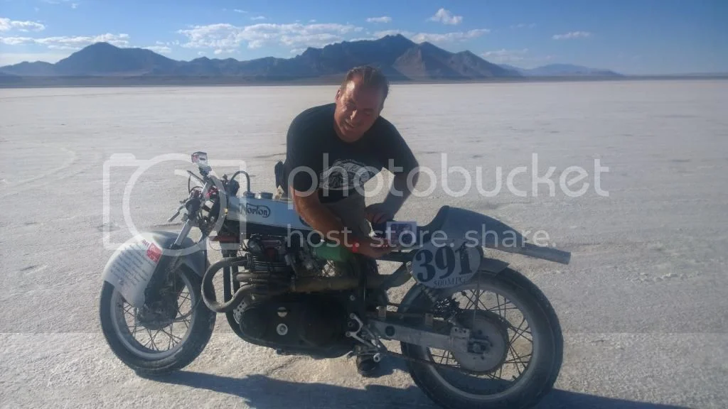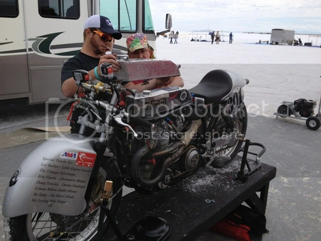 Well I can say that we gave it our all to get the bike to Bonneville this year. My buddy Eric finished all the welding on Tuesday and we brought the bike back to Les. Les finished the motor on Wednesday and we put it in the bike Thursday. We hooked up the ignition and had to guess on the wiring being that my dad purchased this over 5 years ago and I wasn't able to find the paper work. We didn't have spark so we loaded it up and headed home. On the way I called my wife and asked her to look through the box of paperwork on the bike to see if she could find the info on the crank fired ignition. By the time I got on the freeway she called and with good news. We rewired it and still no spark, after messing with it until we hours of the morning we ended up getting spark and felt like we were good to go. The next morning we went to fire it and the timing was not right so we dove into it again and remounted the left pickup on the ignition plate until we had spark and felt that the ignition was close. We loaded up the bike @ 9:00 PM on Saturday and headed for Bonneville and drove straight through to arrive @ 1:30 on Sunday for registration.