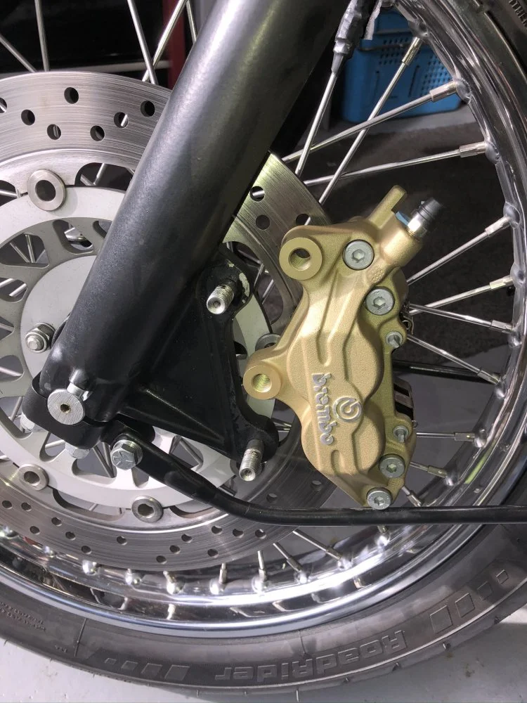 On my commando I have a single 320mm disc a 12mm master cylinder and a 4 pot nissin it really is a good brake with loads of feelNow then boys, inspired by the really rather excellent Brembo / cNw brake on my Commando, I have hatched a cunning plan for the T140 front brake. I reckon the caliper below would match up wonderfully to the 13mm master cylinder body I already have.