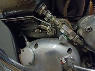 In order to gain better access to the adjuster nuts, I slide the oil feed and return flexible pipes off of the oil pipe junction block, (to the rear of the timing case). Even if I did not have the tap installed, I would still do this anyway, (saves stress to the flexible pipes and (if fitted) the rather inadequate looking stock, (non barbed) pipe interface on the rear of the oil filter). Maybe overkill, but anything to avoid oil on the rear tyre and or a seized engine. Plus, with the tap fitted I don't even have to drain the oil tank first!
