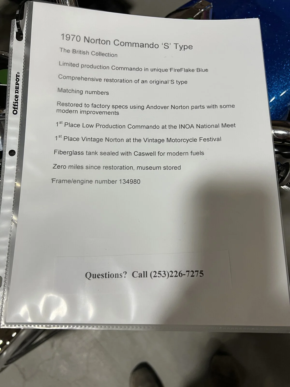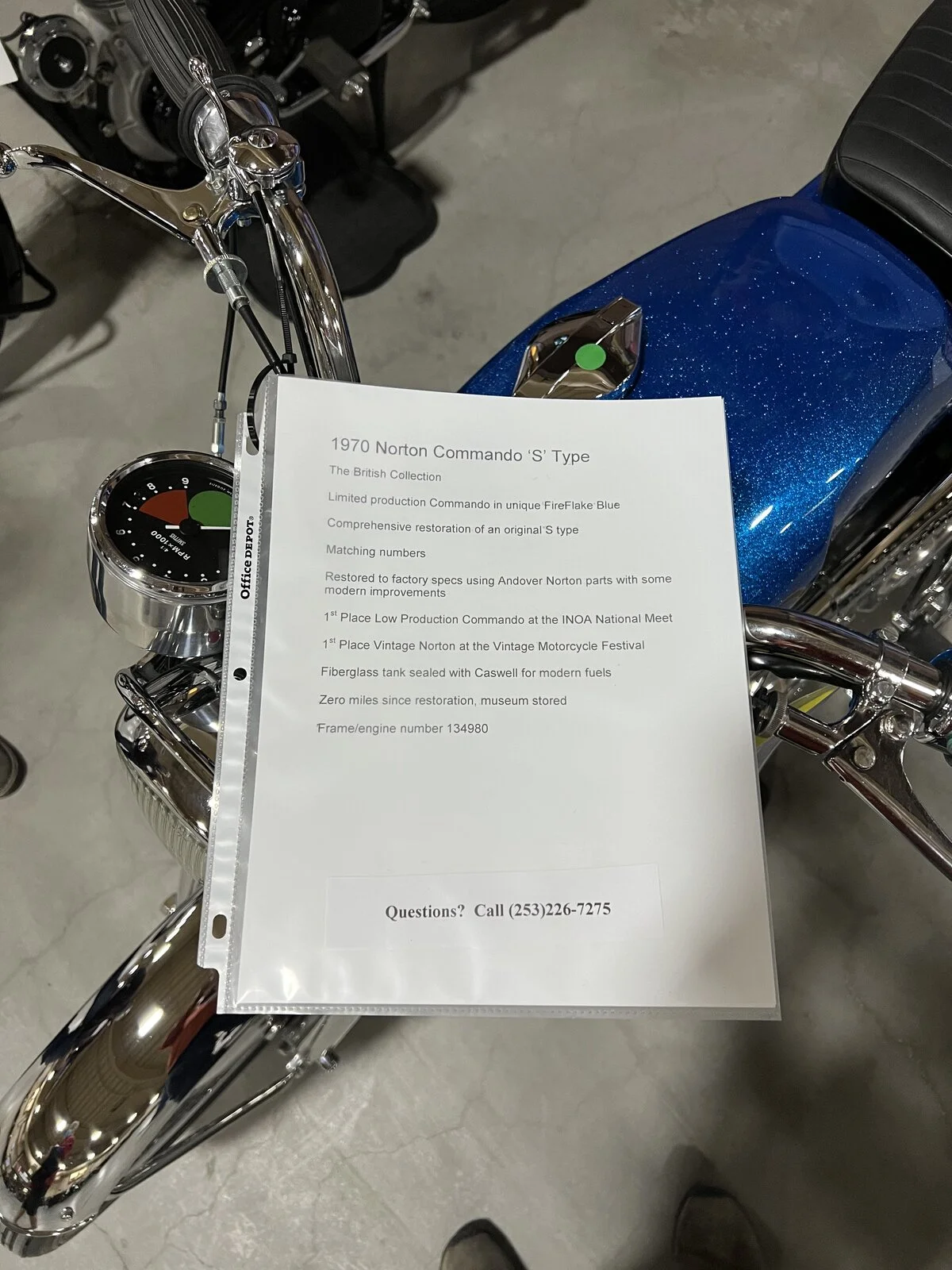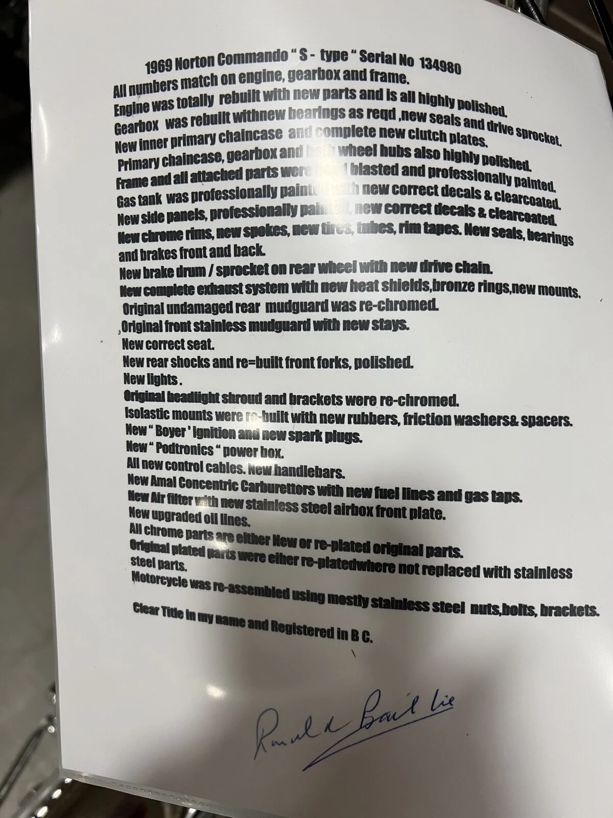 Commando was completley restored from the crank up with tons of new parts about 5 years ago with about 3K miles since. Except for blued pipes and a few minor chips it still looks and runs great. Not 100% factory has numerous upgrades, ei, 3 phase alt, podtronics, premier carbs, stainless lines, 75 seat, later tail-light, powder coated. Clear title and regularly ridden