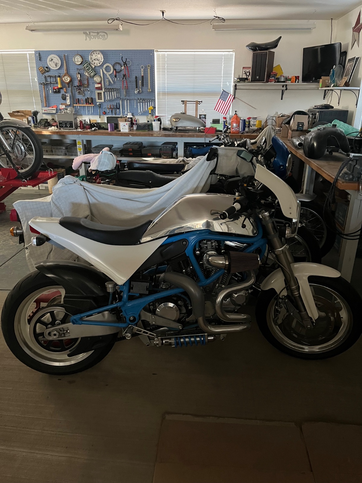 I really don’t think that you could find a better frame for the motor. This damn thing has a fire breathing dragon in it, I start it every year and take it out for a ride. The engine has a stage two 1250 kit and the heads are flowed and bigger intake valves. It’s a S1W so it has the thunderstorm cams and the smooth bore Mikuni. I don’t ride it anymore than the short once a year ride as it’s not registered anymore. It’s a shame that they don’t sell well or this one would be gone, they love them in Japan and other places across the pond but not here for some reason. Just the tank cost me with shipping about 1,000 dollars. And when they do sell they are pulling the motor out of them, and that’s a shame in my mind. I’m getting a bit too old to be riding a bike like this. When me and my brother went to buy this bike (he’s the one that got me into the thing) the owner was telling us that he was 61 years old. We both were shocked that he still rode it, I’m turning 65 this summer and an old gray haired man should not be a bike like this. lol 😂