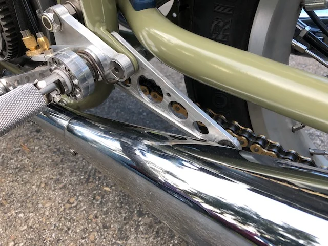 I got some custom cables from Venhill with an m6 threaded rod pressed onto the one end of the cable and had to route the cable from the drive side rear set to the timing side brake, which is a bit more complicated than the rod scenario of the conical, but not really a big problem. A tab for the torque stay had to be brazed onto the swingarm as well.