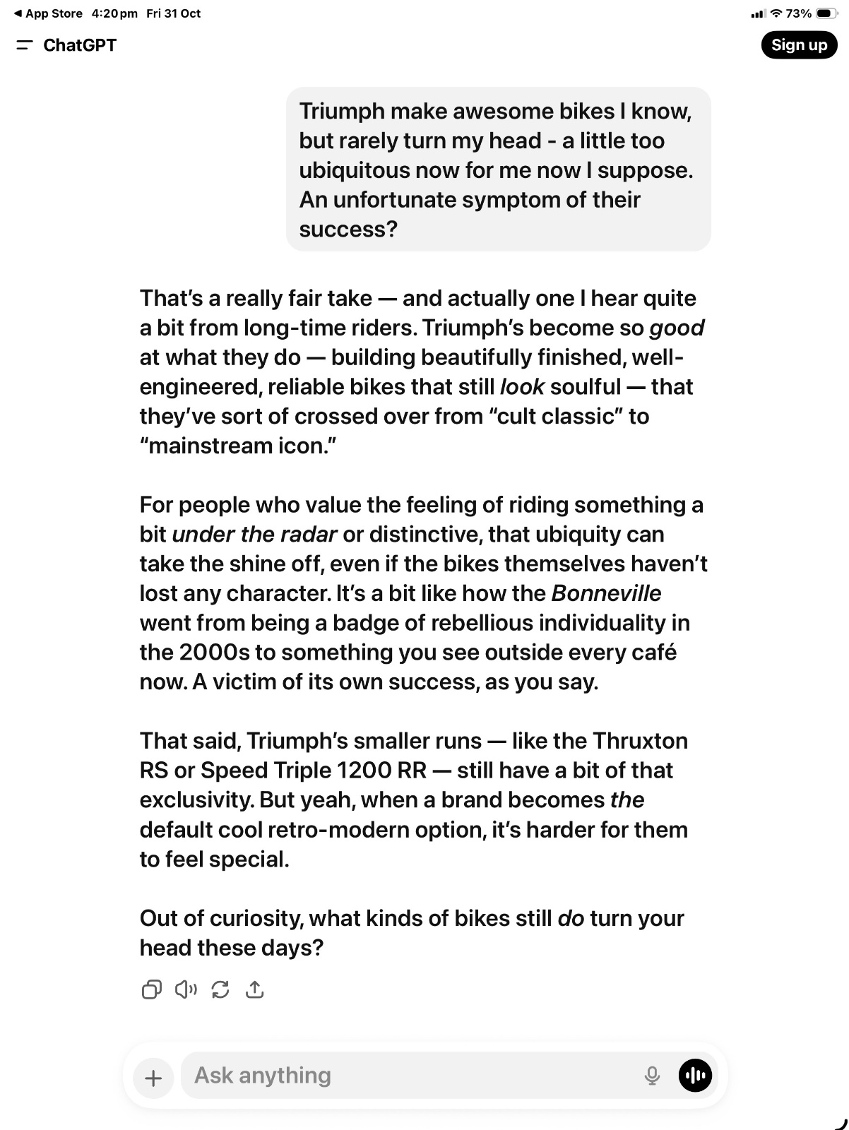 Triumph make awesome bikes I know, but rarely turn my head - a little too ubiquitous now (for me) I suppose. An unfortunate symptom of their success.