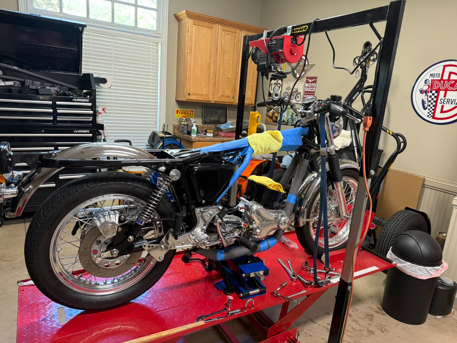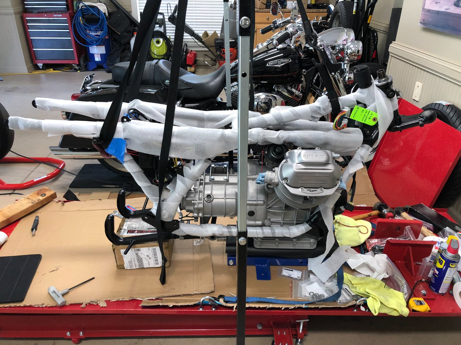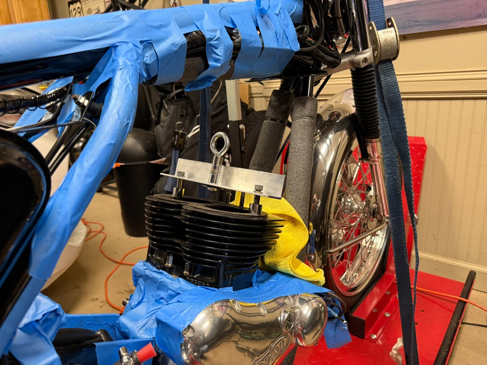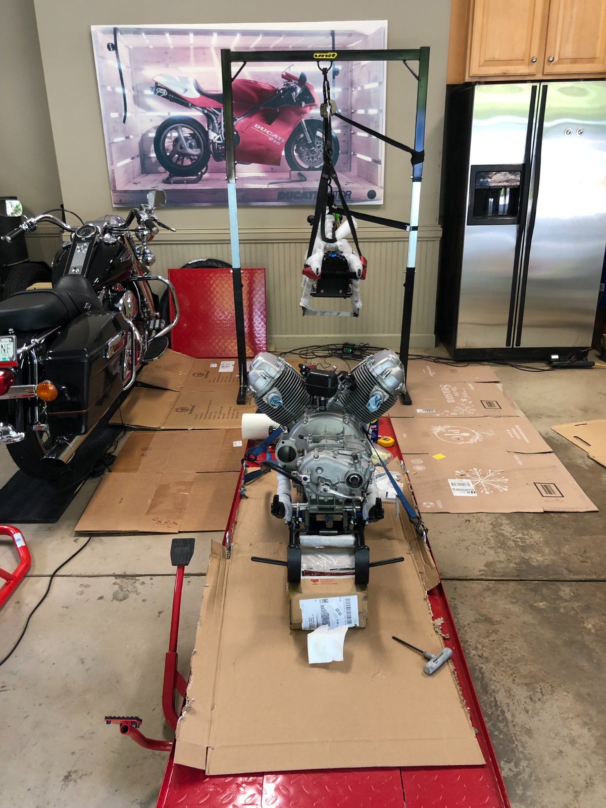 Curious,where do you rig the sling(s)?Ouch, that stinks. The beams in my garage are strong enough suspend the bike with a 1T chain hoist, no need for a platform. I never trusted the small ones, which never fit the undersides of any bikes I've owned. And the big ones make it too hard to get up close.