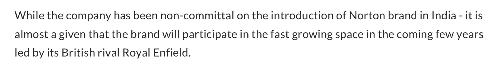 It‘s been mentioned that Norton will likely access the Indian market at some stage. I suspect the ‘point‘ might be to manufacture in India, potentially badge it Norton and sell off the back of Nortons cred - in competition with RE (at the more budget end of the market). I don’t necessarily think that it will be a bike(s) they introduce into their principle markets. Maybe down the track - who knows.