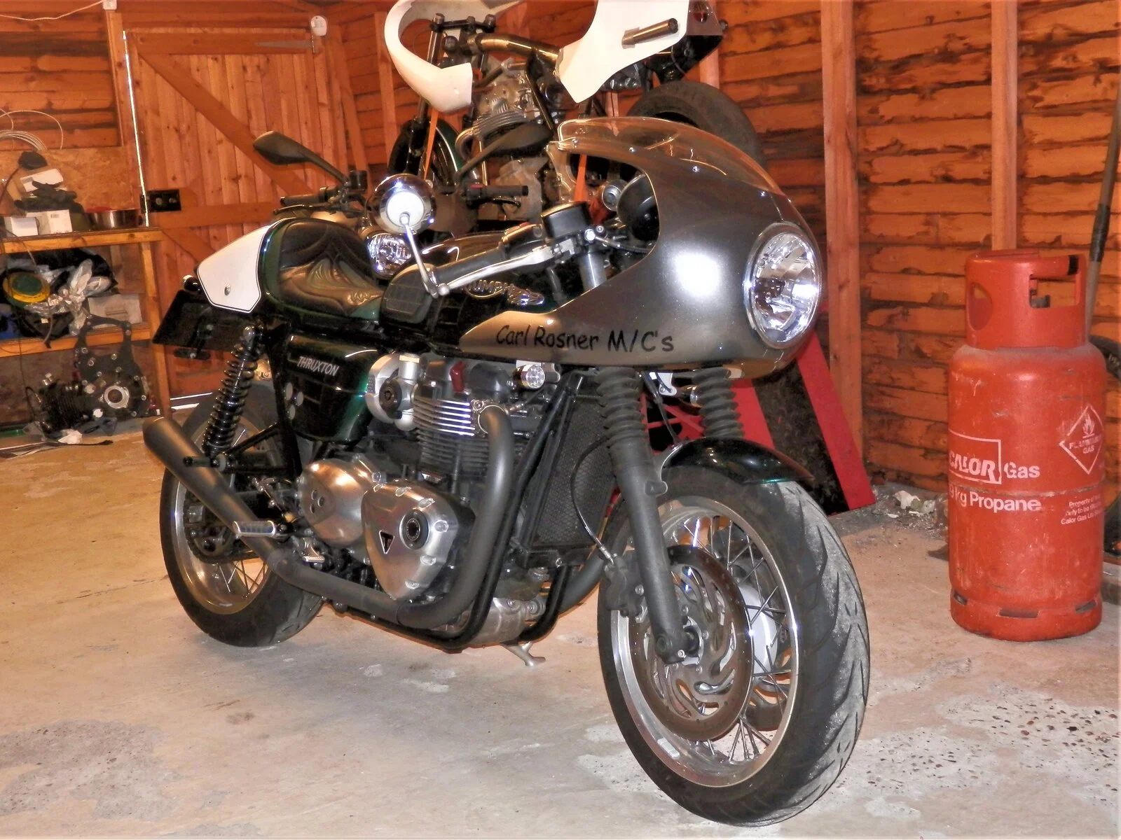 I fell in love with a 2016 Thruxton 1200S brought new 2018 new old stock at a greatly reduced price Competition Green, and fairing kit fitted, the first upgrade was put the stock bars back on as the fairing kit lower bars were too low then a Meerkat x-pipe and Meerkat opened up my stock mufflers and a set of Ikon rear shocks.