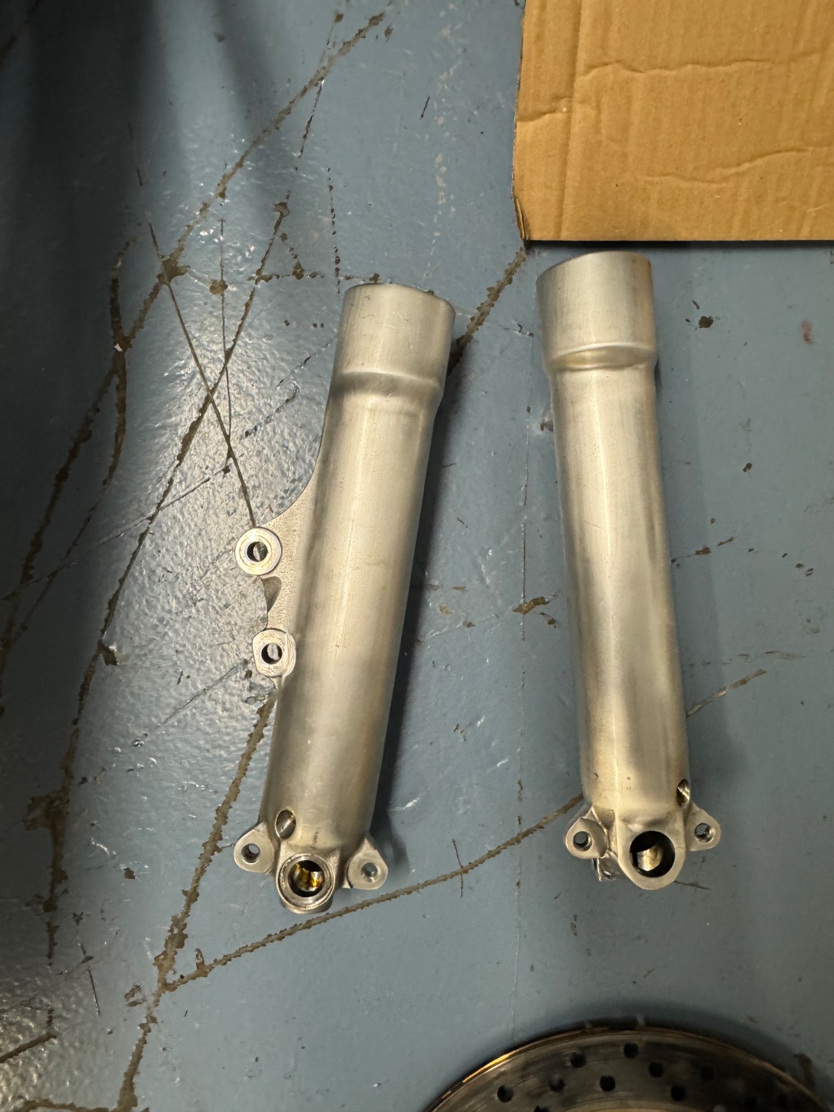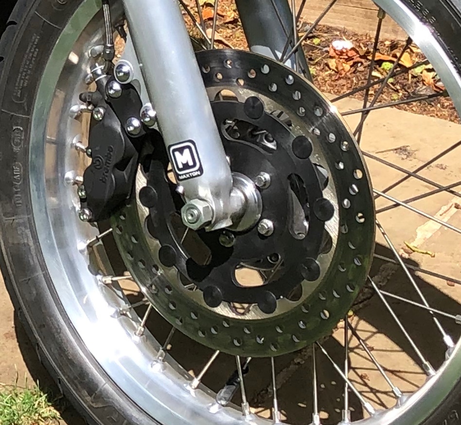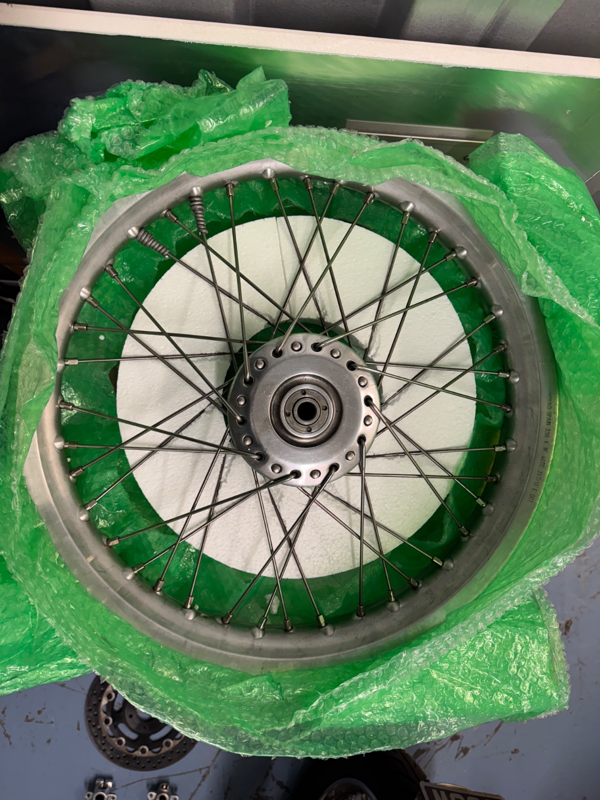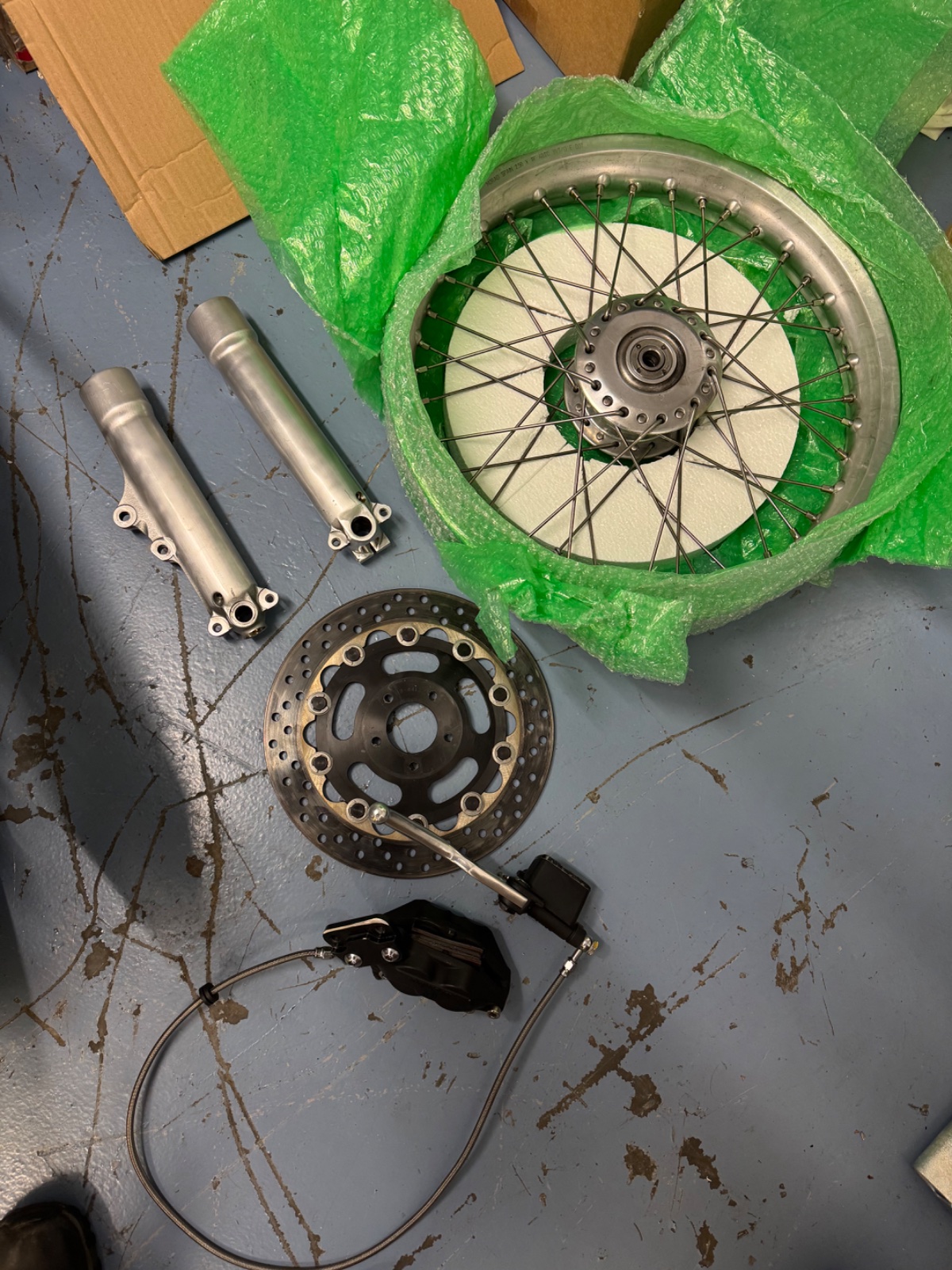 On top of this is a complete front wheel with disc hub inc bearings etc, with a flangless 2.50 x 19 alloy rim and stainless spokes built by Central Wheels in U.K.