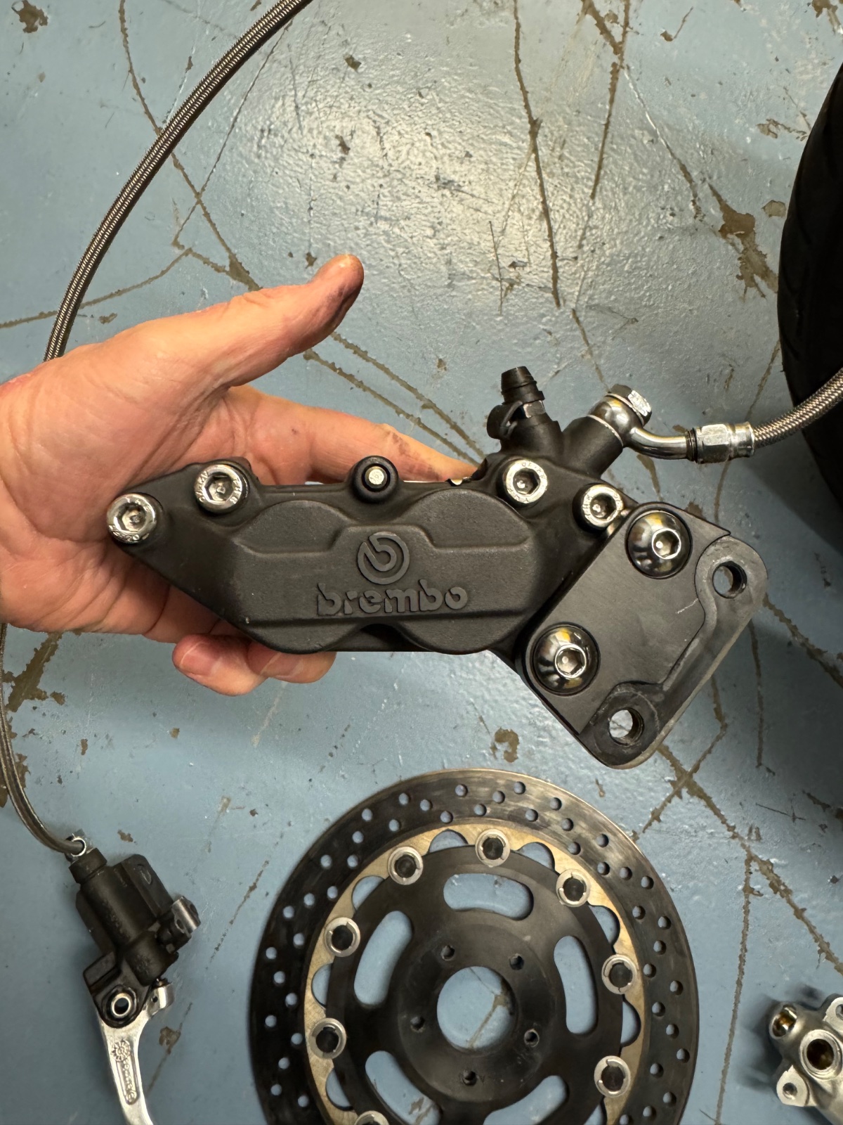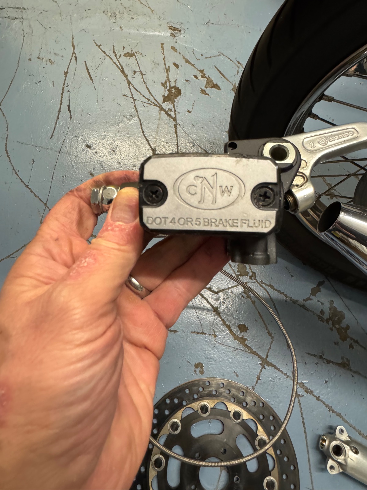 Complete cNw kit which includes Brembo disc, Brembo 4 piston caliper, caliper adaptor, Brembo 13mm master cylinder with cNw milled logo lid, and a stainless hose.