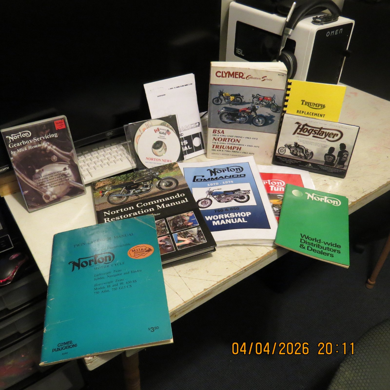 Mick Hemmings DVD's on Commando Engine rebuild and Gearbox rebuild instructional, Commando restoration book, Clymer Norton Triumph and BSA service , repair and maintenance manual, The Norton 3rd and 4th edition CD's, 750 Norton Commando owner's manual copy, Triumph replacement parts catalogue for 650 twins, Norton dist/ Dealer list, Norton tuning by Paul Dunstall and a Norton Commando 750 1970-1974 Workshop Manual.