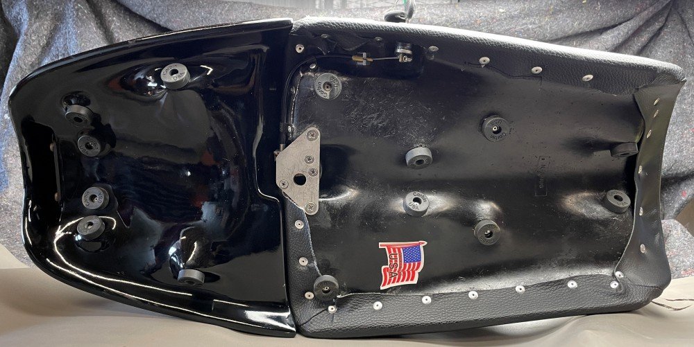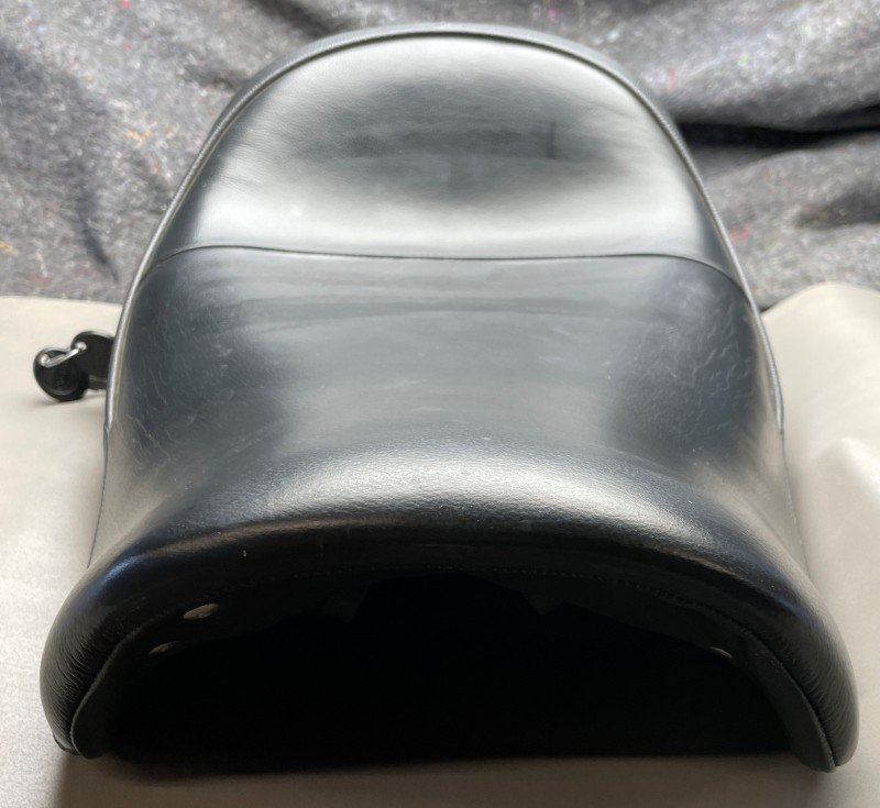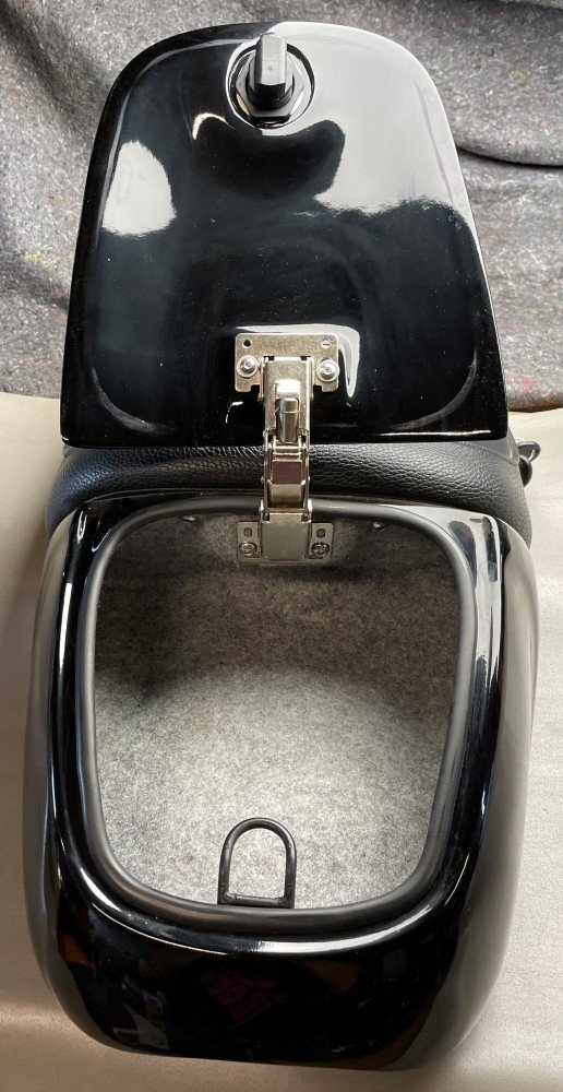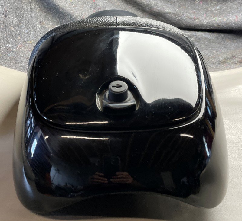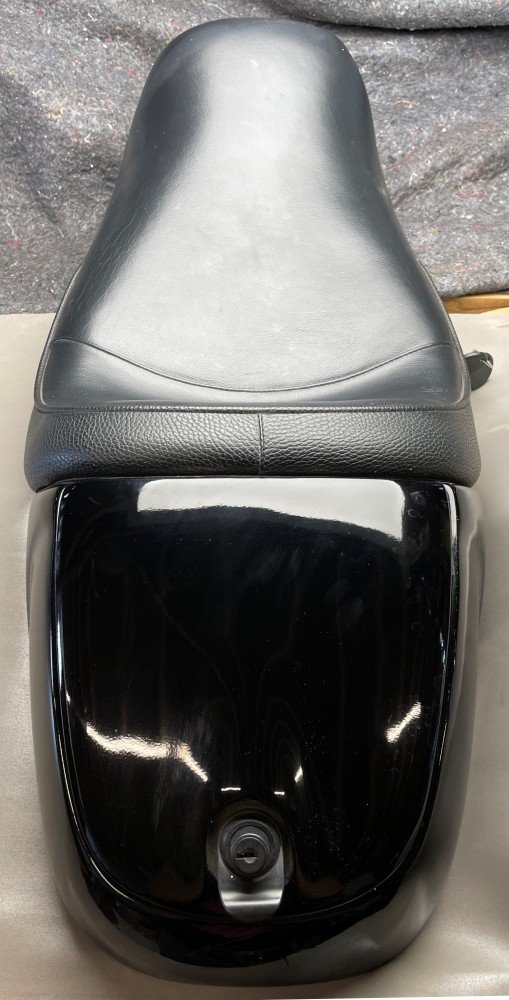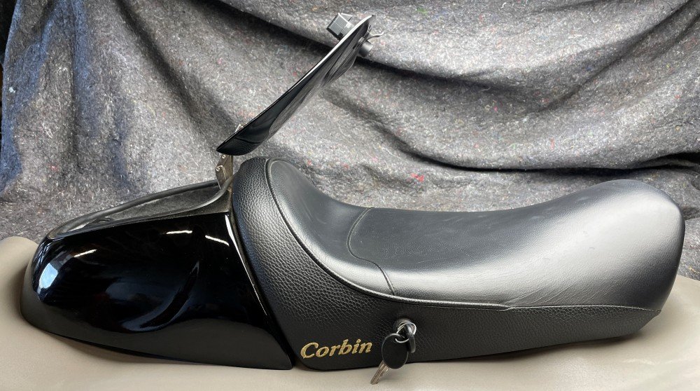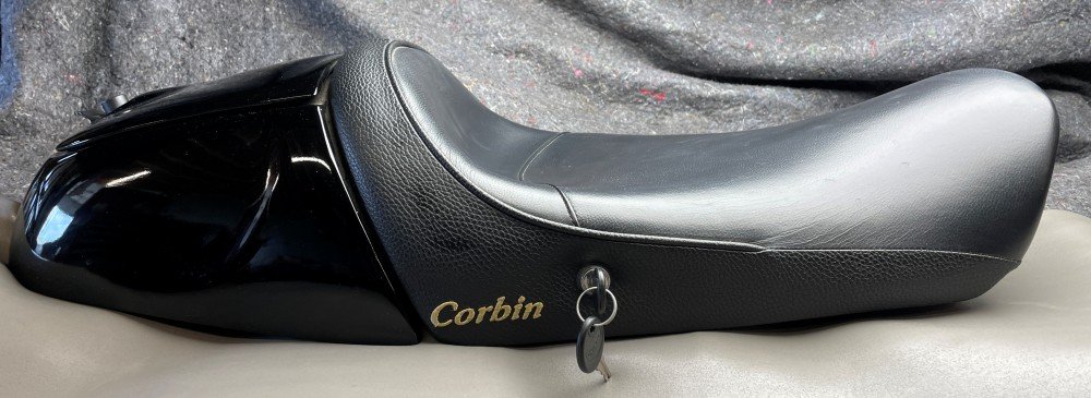 This is a LIKE-NEW Corbin Smuggler seat with locking base & storage compartment. Black paint on the compartment, black leather upholstery, inside compartment gray "carpet". Comes with 2 keys (locking base and locking storage compartment).