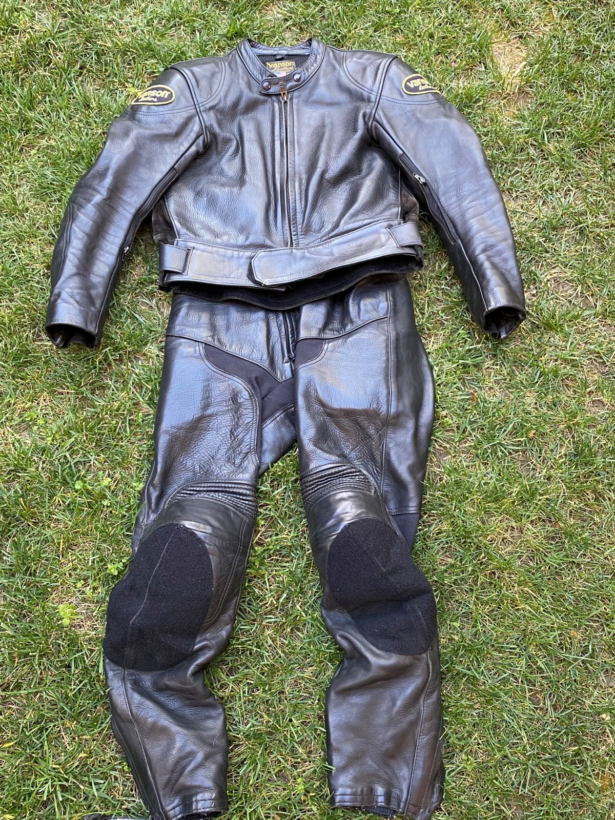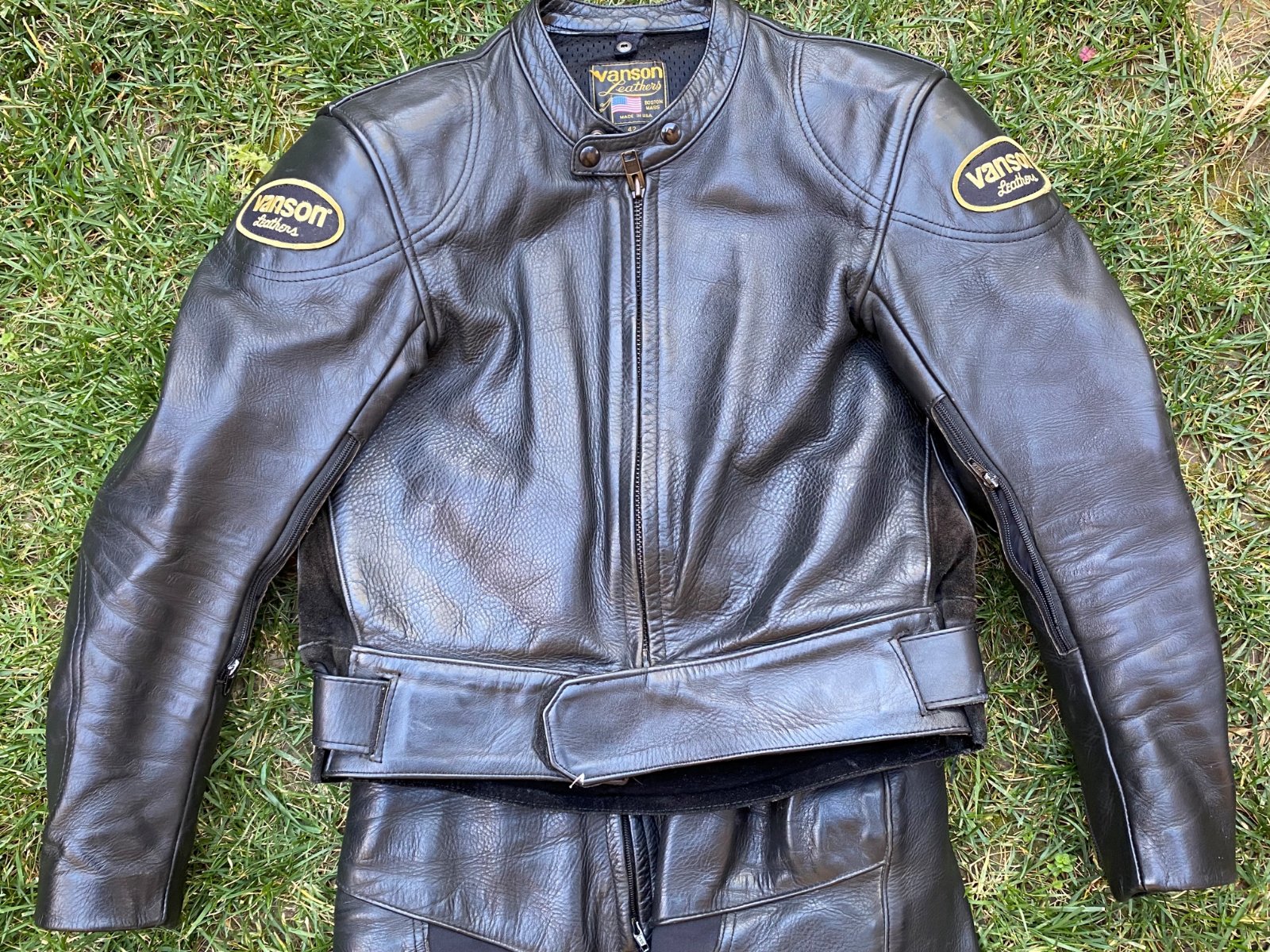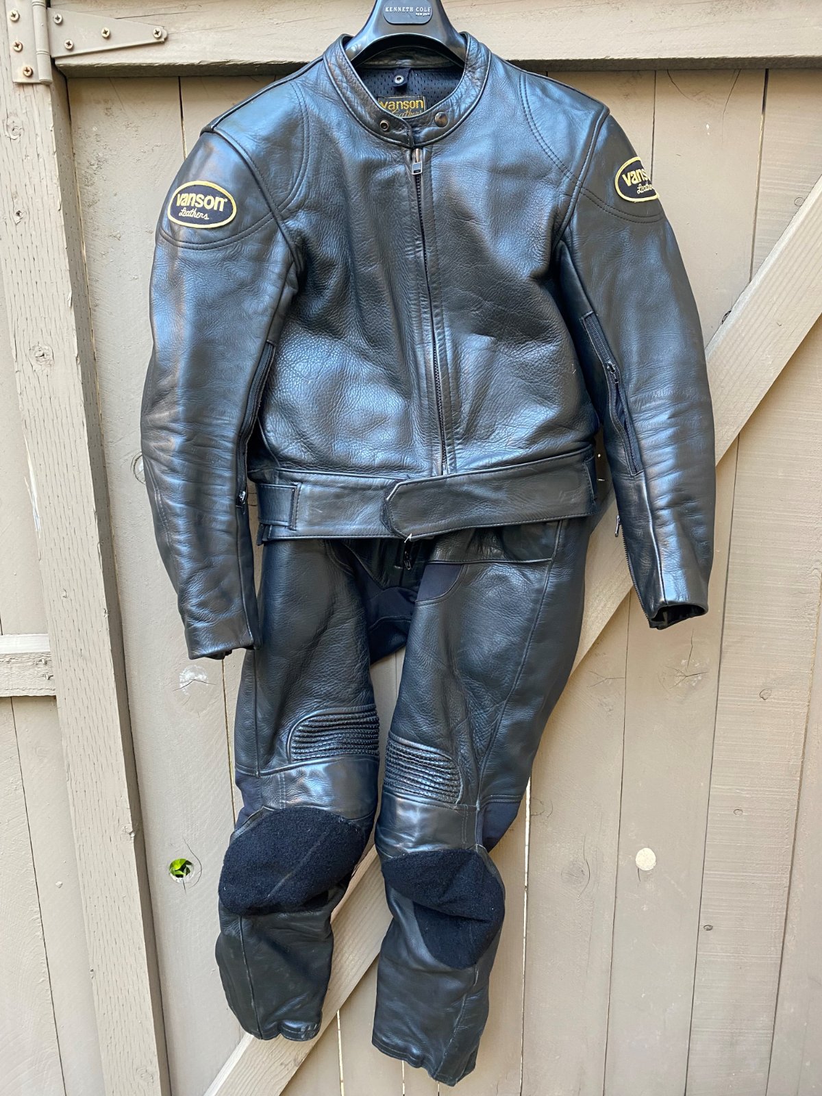 Vanson Leathers, size 42. Will fit riders 5' 10" - 6'1, weighing 145 lbs - 170 lbs. Never crashed, very broken in and in wonderful condition. Regularly conditioned with leather conditioner. Pants and jacket has built in body armor, which is removable. All zippers, snaps, buckles and velcro fully functional. Jacket and pants zip together.