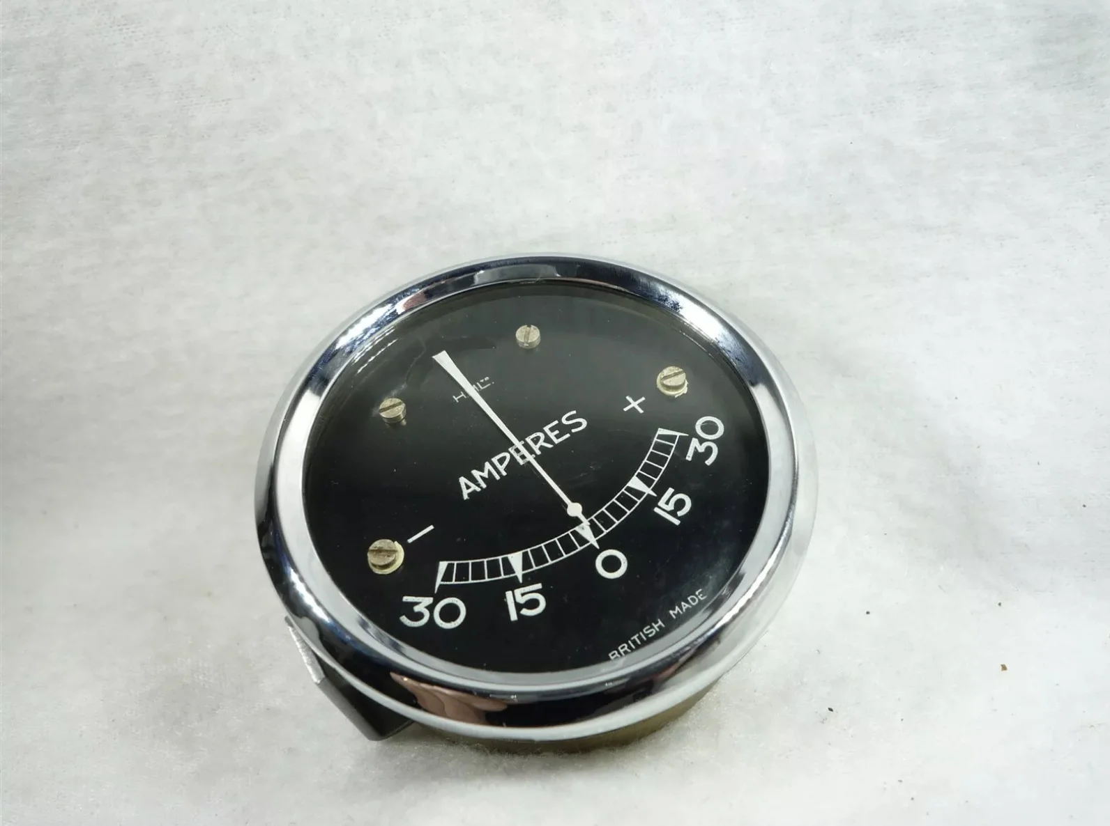30 amp original external/side illuminated period 2" ammeter made by HM Ltd. Gauge has been fully dismantled, inspected, cleaned, casing has been blasted, new bezel, glass and seals fitted. Gauge has also been tested to 30 amps in both directions so I can confirm it works correctly. In excellent condition throughout. To fit a 52 mm hole, outside diameter of bezel is 56 mm.