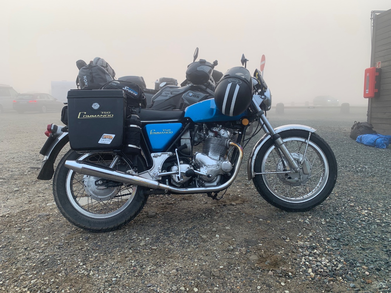 My 1972 Commando parked up at Nordkapp around 2.00 am. Being June it was still light but quite foggy. Normally at that time of day access to the globe by motorcycle wouldn’t have been denied as all the staff at the visitor centre would have gone home. However, as it was foggy, there was a Norwegian on duty to stop anyone from riding to it as there were still people walking around the area as it gets very busy. The Norwegian guy was sat in the car with the headlights on in the right of the picture.